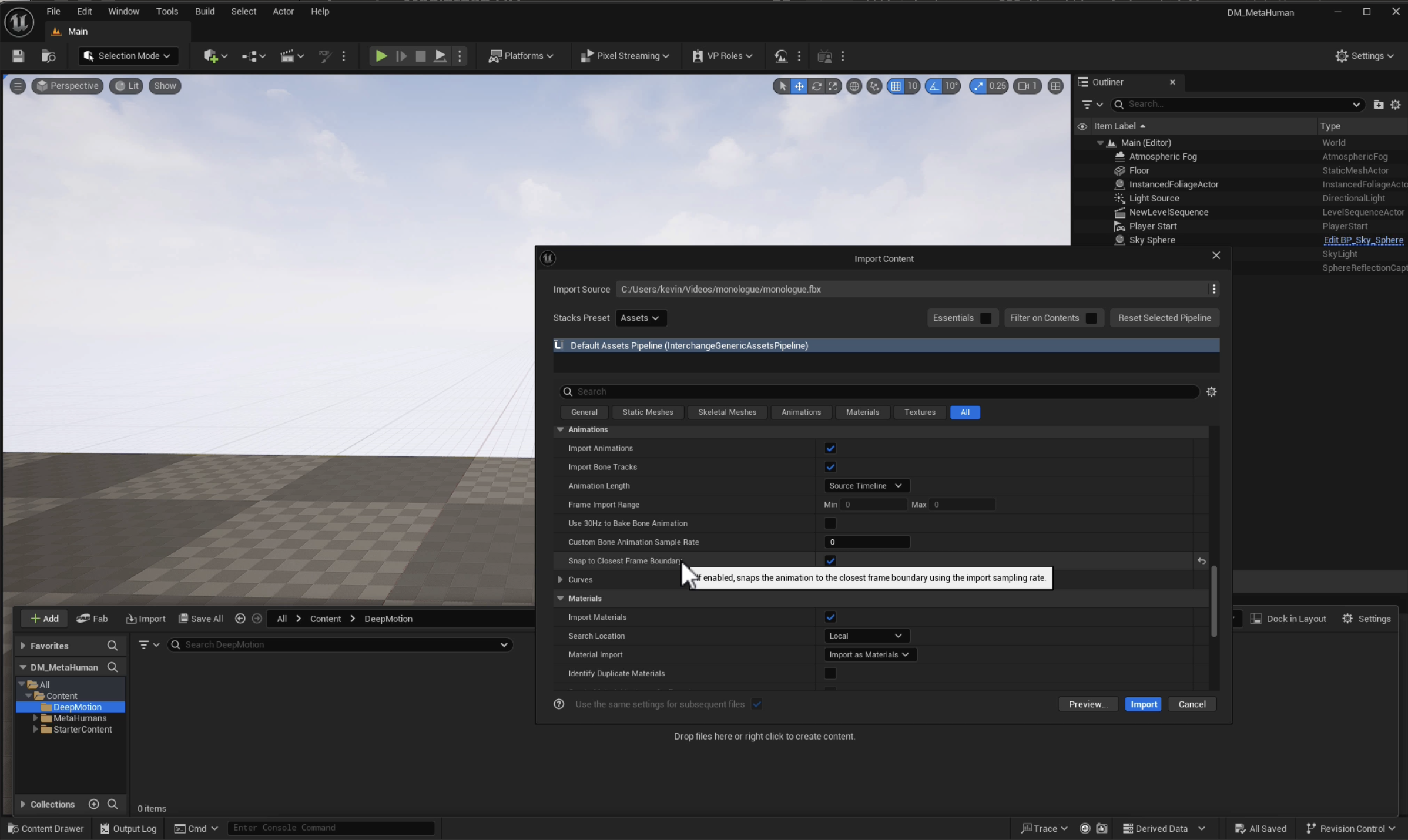 Drag and drop the FBX file exported from DeepMotion to the Content Drawer